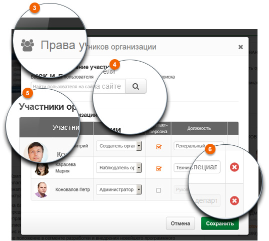 Назначение прав доступа пользователей к странице организации выполняется пользователем с правами «Создатель» или «Администратор» организации в модуле «Права участников»
